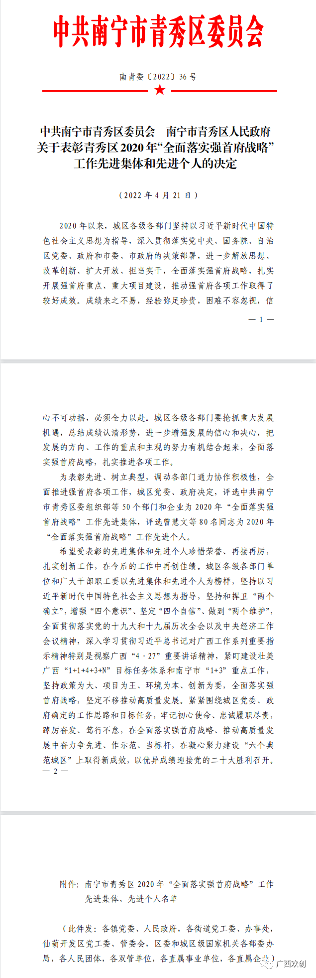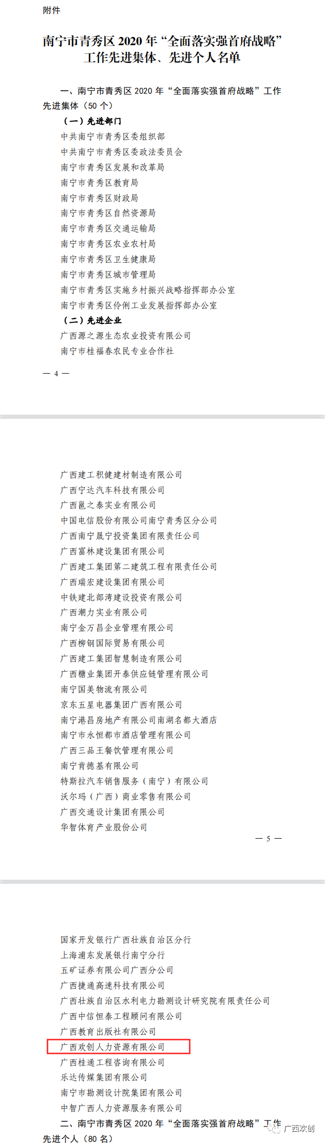 根据中共南宁市青秀区委员会、南宁市青秀区人民政府发布的相关文件精神,广西欢创人力资源有限公司荣获青秀区2020年“全面落实强首府战略” 工作先进集体荣誉称号。