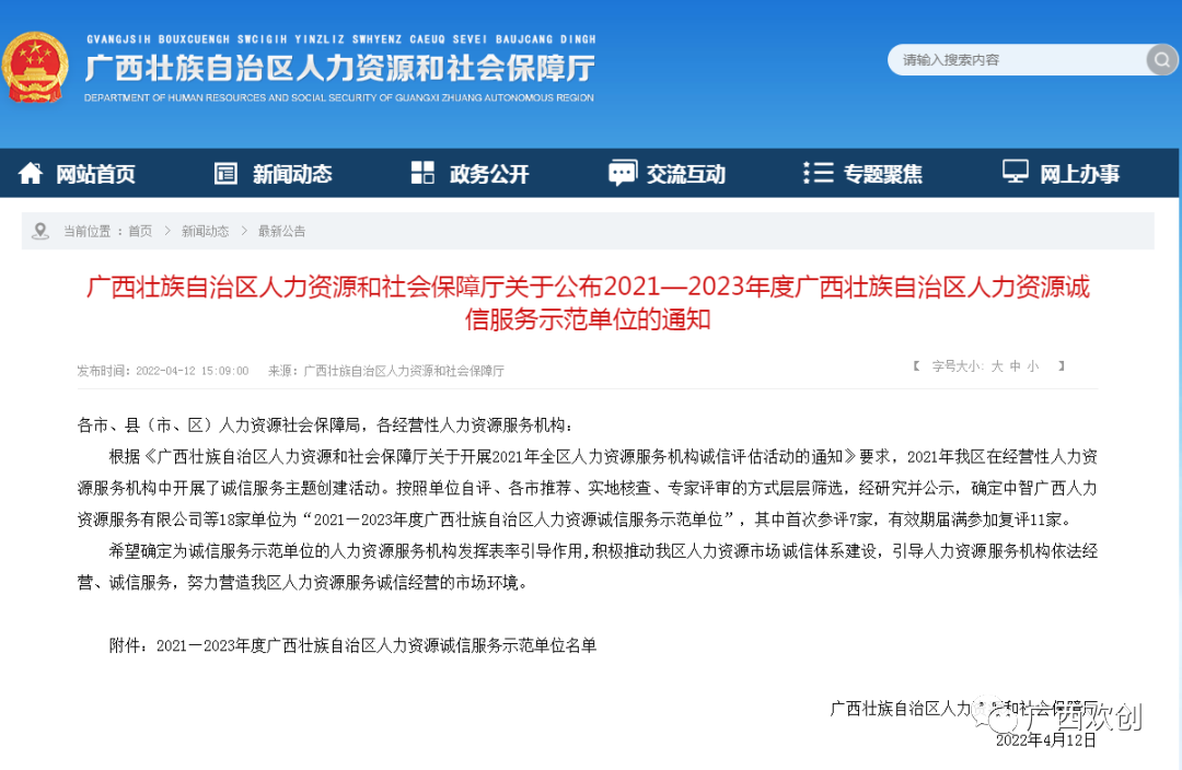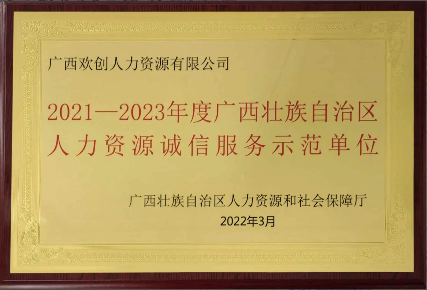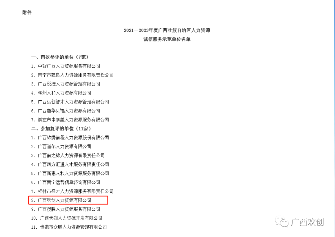 根据《广西壮族自治区人力资源和社会保障厅关于开展2021年全区人力资源服务机构诚信评估活动的通知》要求,2021年我区在经营性人力资源服务机构中开展了诚信服务主题创建活动。按照单位自评、各市推荐、实地核查、专家评审的方式层层筛选,经研究并公示,确定广西欢创人力资源有限公司为“2021—2023年度广西壮族自治区人力资源诚信服务示范单位”。
