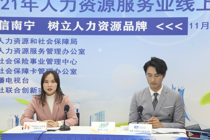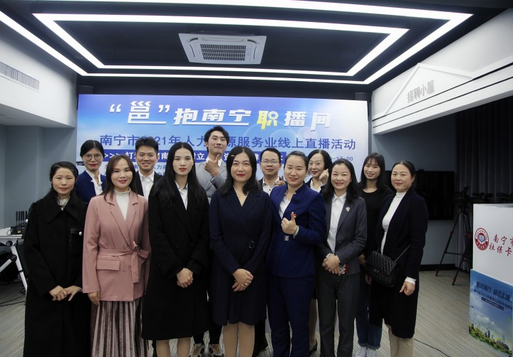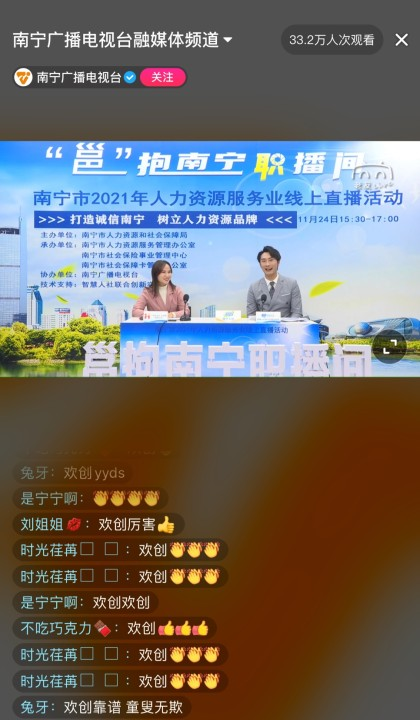 11月24日,由南宁市人力资源和社会保障局主办,南宁市人力资源服务管理办公室、南宁市社会保险事业管理中心、南宁市社会保障卡管理办公室承办,南宁广播电视台协办,智慧人社联合创新实验室提供技术支持的“邕”抱南宁“职播间”——南宁市2021年人力资源服务业线上直播活动开启。广西欢创人力资源有限公司应邀出席,并为大家直播“带岗”。