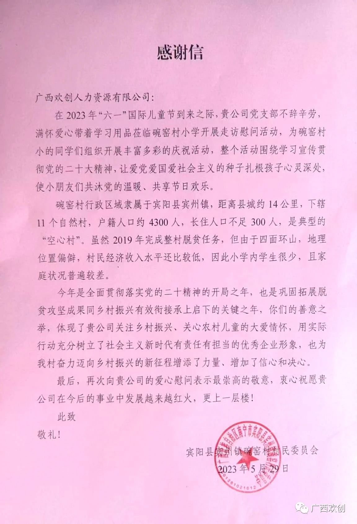 碗窑村委代表对关注山区教育事业发展,关心关爱偏远地区留守儿童的广西欢创人力资源有限公司善举表示谢意。