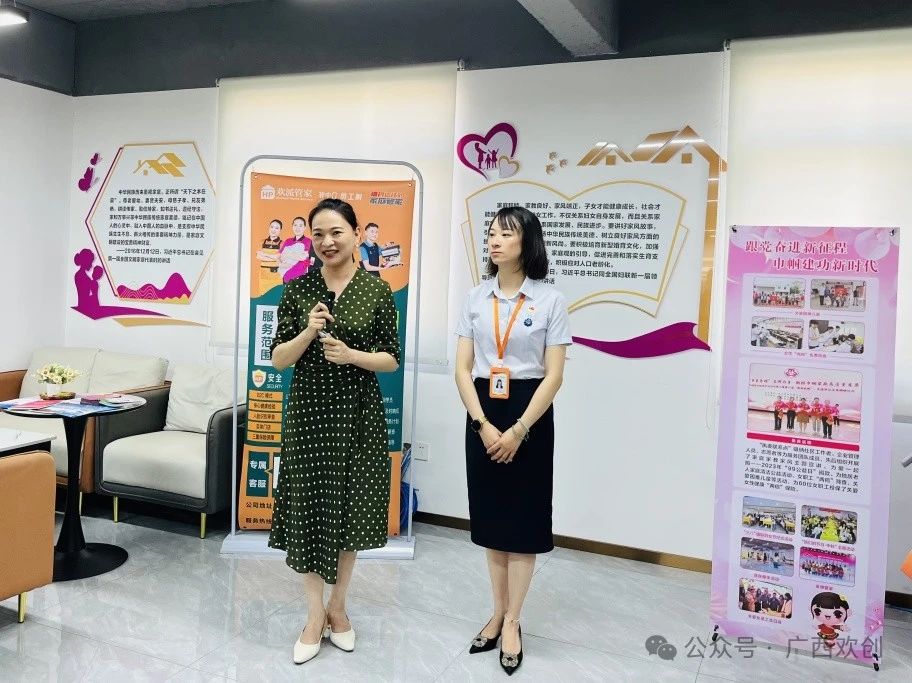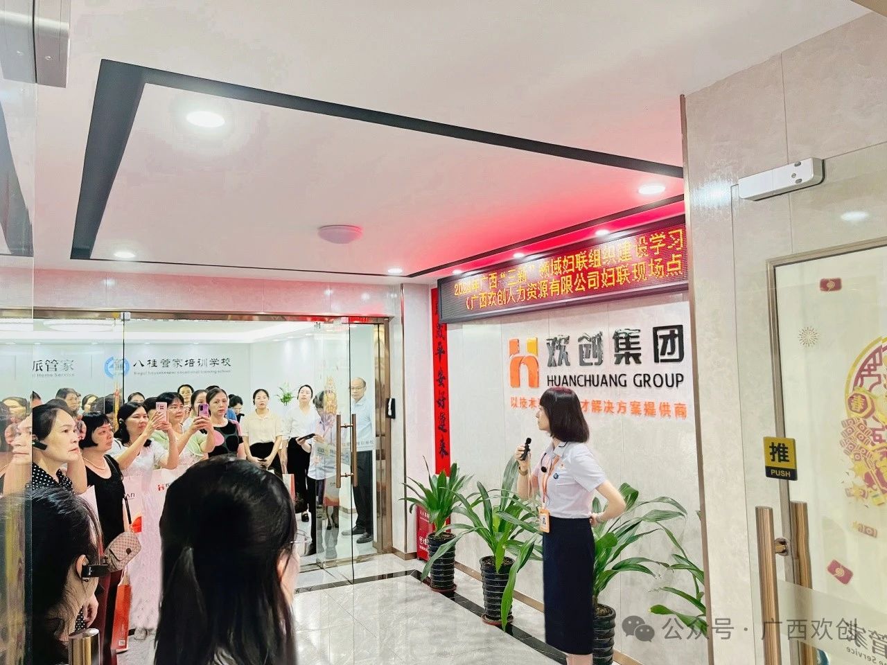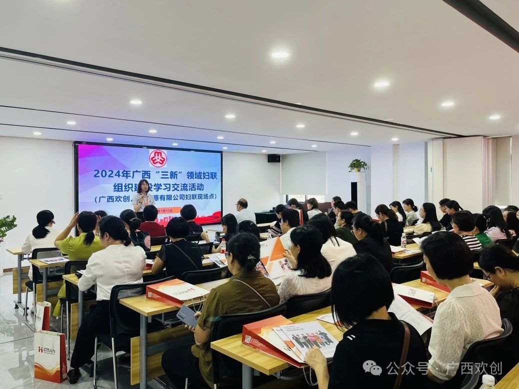 为深入学习贯彻习近平新时代中国特色社会主义思想,学习贯彻习近平总书记关于广西工作论述的重要要求,认真落实全国妇联关于推进新经济组织、新社会组织、新就业群体领域(以下简称“三新”领域)妇联组织建设的工作部署,推进“三新”领域妇联组织建设全覆盖,自治区妇联于2024年7月15日至16日在南宁市举办2024年广西“三新”妇联组织建设学习交流活动,全区各地市妇联分管副主席、组织部主要负责同志、县(市、区)妇联主席代表共60人参加交流活动。广西欢创人力资源有限公司为其中一个考察点。