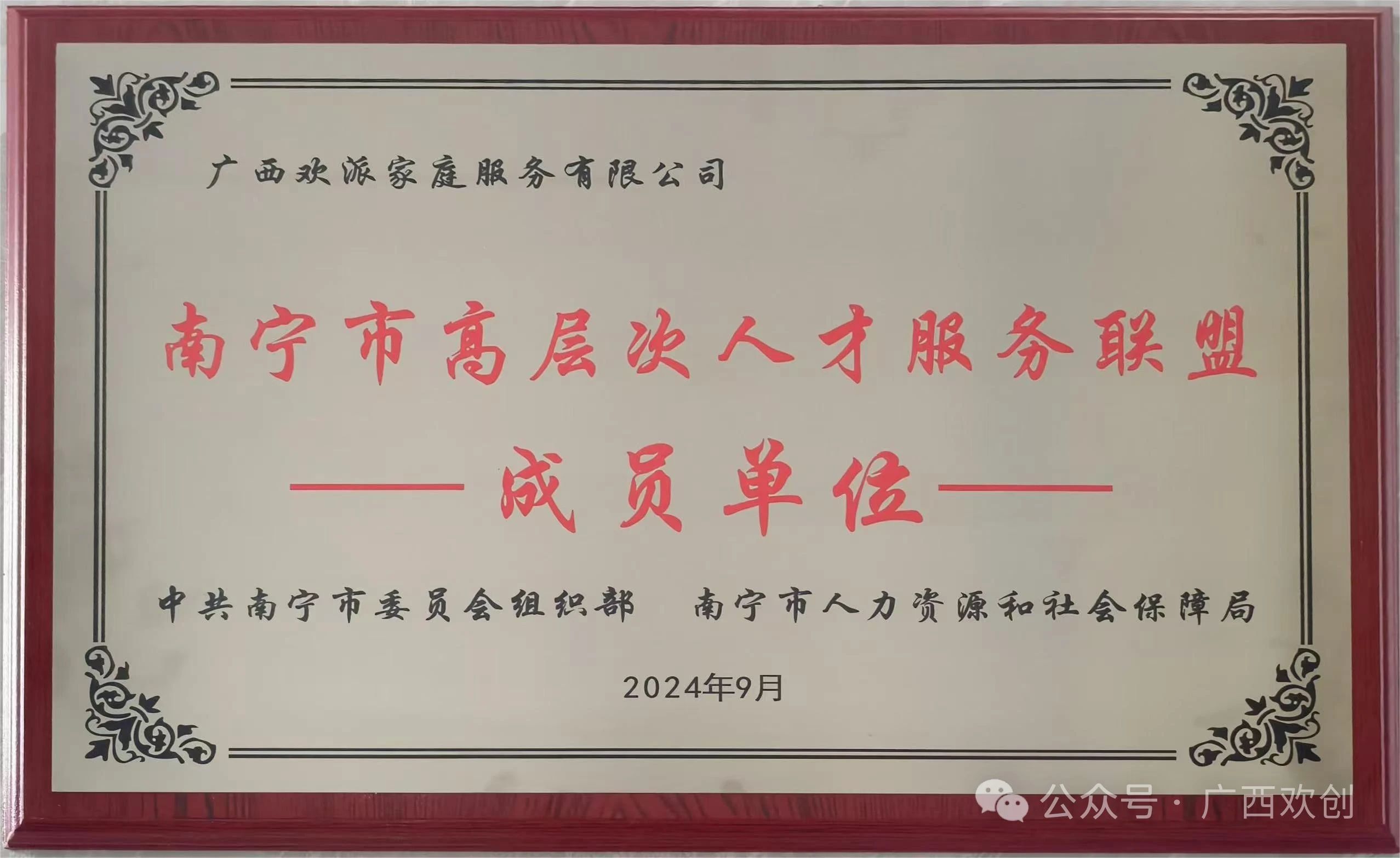 广西欢创人力资源有限公司及旗下子公司——广西欢派家庭服务有限公司都被授予“南宁市高层次人才服务联盟成员单位”,双份荣誉,双份责任。