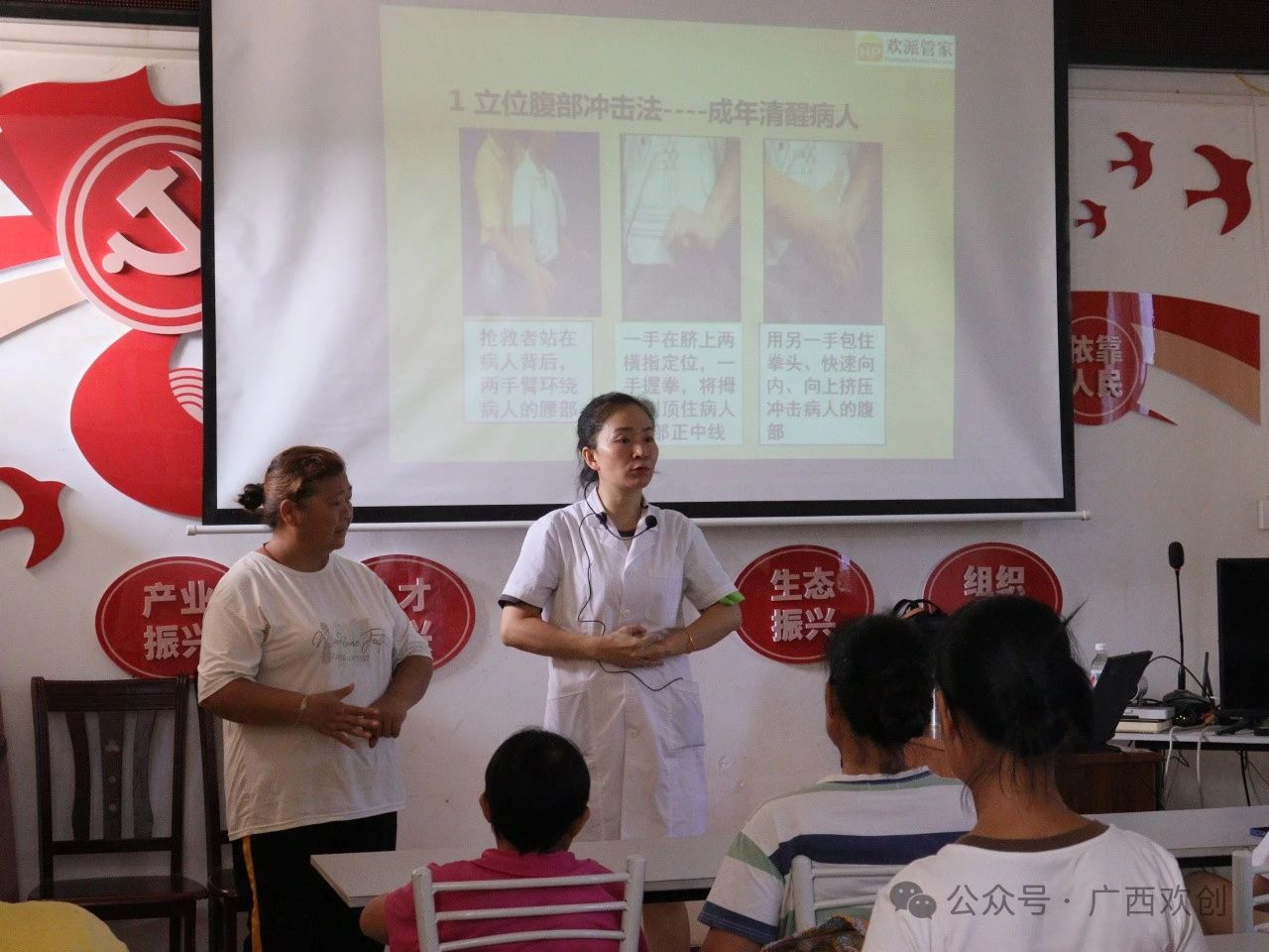广西欢派家庭服务有限公司的授课老师采用现场展示和实操体验的方式为大家开展养老护理免费培训课程。老师首先介绍了养老护理的前景,随后用通俗易懂的语言和手法为村民们讲解了基础生命体征检查、急救处理等内容。