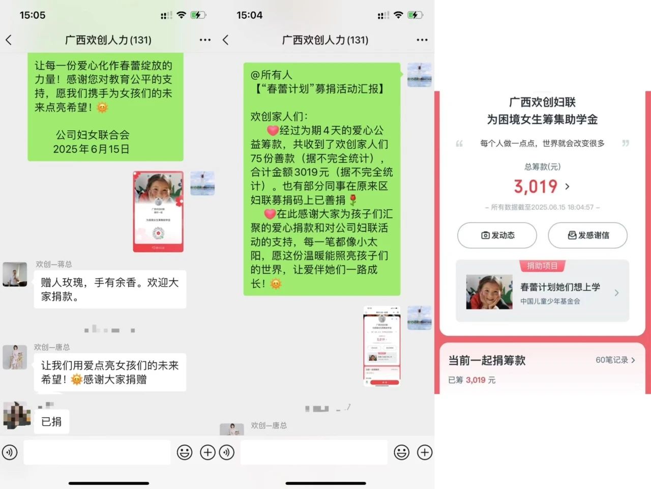 6月12日,广西欢创人力资源有限公司妇女联合会积极响应自治区妇联的号召,组织开展了爱心募捐活动。公司全体员工积极参与,积小善,成大爱,以实际行动为社会尽一份责任,献上自己的一份爱心。经过在公司内部发动爱心公益筹款,共收到了75份善款,合计金额3019元(据不完全统计)。捐赠不论多少,善举不分大小,一笔笔善款汇聚成一股股爱心暖流流进贫困女童的心田,每一份爱心都将化作春蕾绽放的力量助她们乘风破浪、向阳生长。