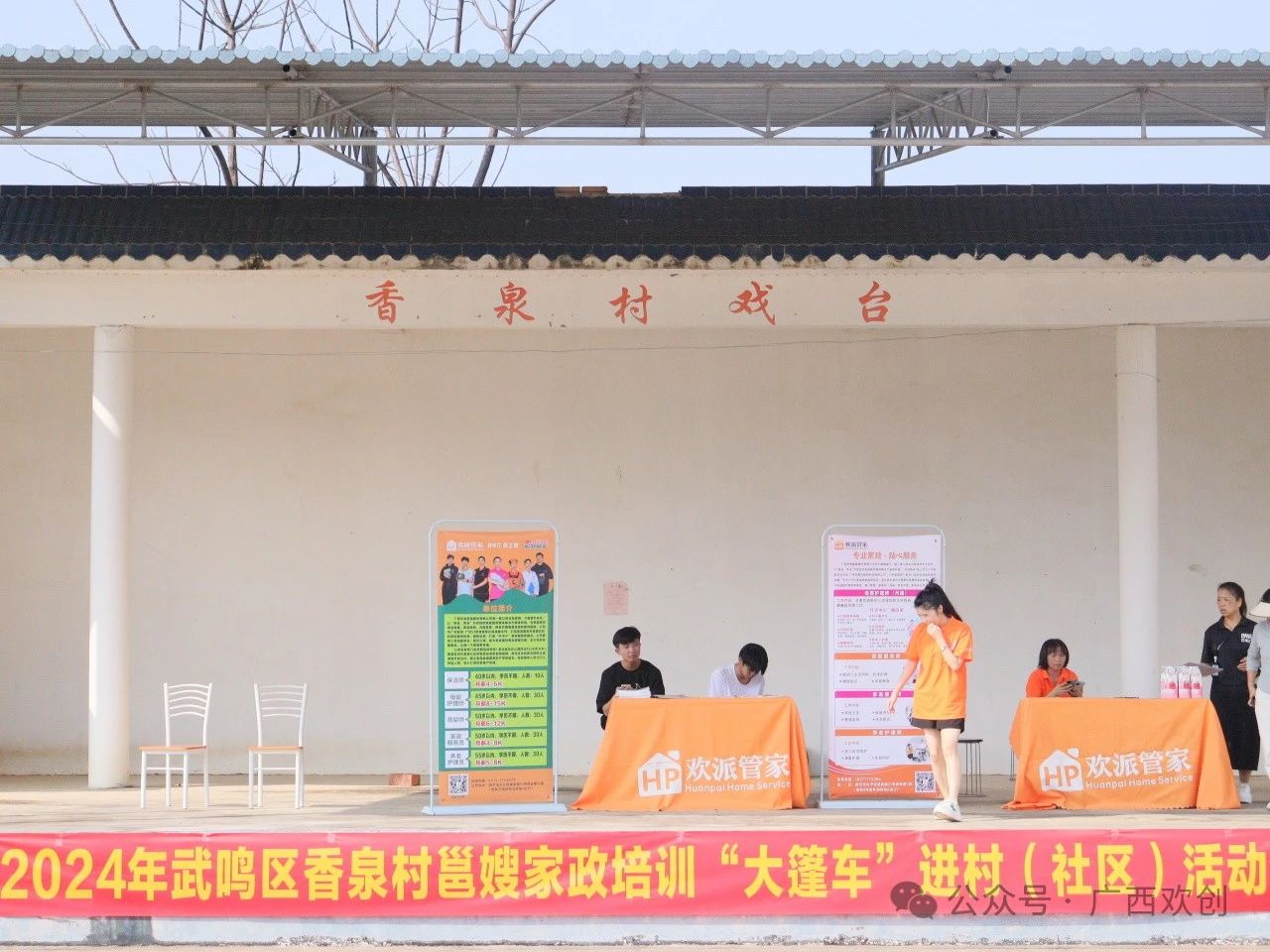 2024年9月14日,由南宁市妇联主办,南宁市巾帼家庭服务行业协会、广西欢创子公司--广西欢派家庭服务有限公司承办的“2024年武鸣区香泉村邕嫂家政培训“大篷车”进村(社区)活动”在武鸣区香泉村举办,吸引85余名村民参加。